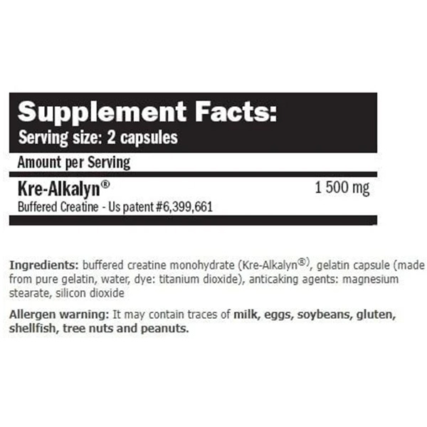 Ingredients: buffered creatine monohydrate (Kre-Alkalyn®), vegetable capsule (hydroxypropylmethylcellulose, purified water, dye: calcium carbonate),anticaking agents: magnesium stearate, silicon dioxide.